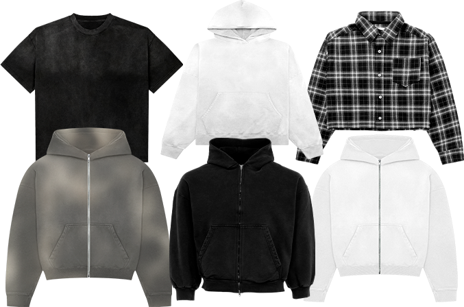 A curated starter collection — hoodies, tees, pants, and jackets. The core garments every designer needs.